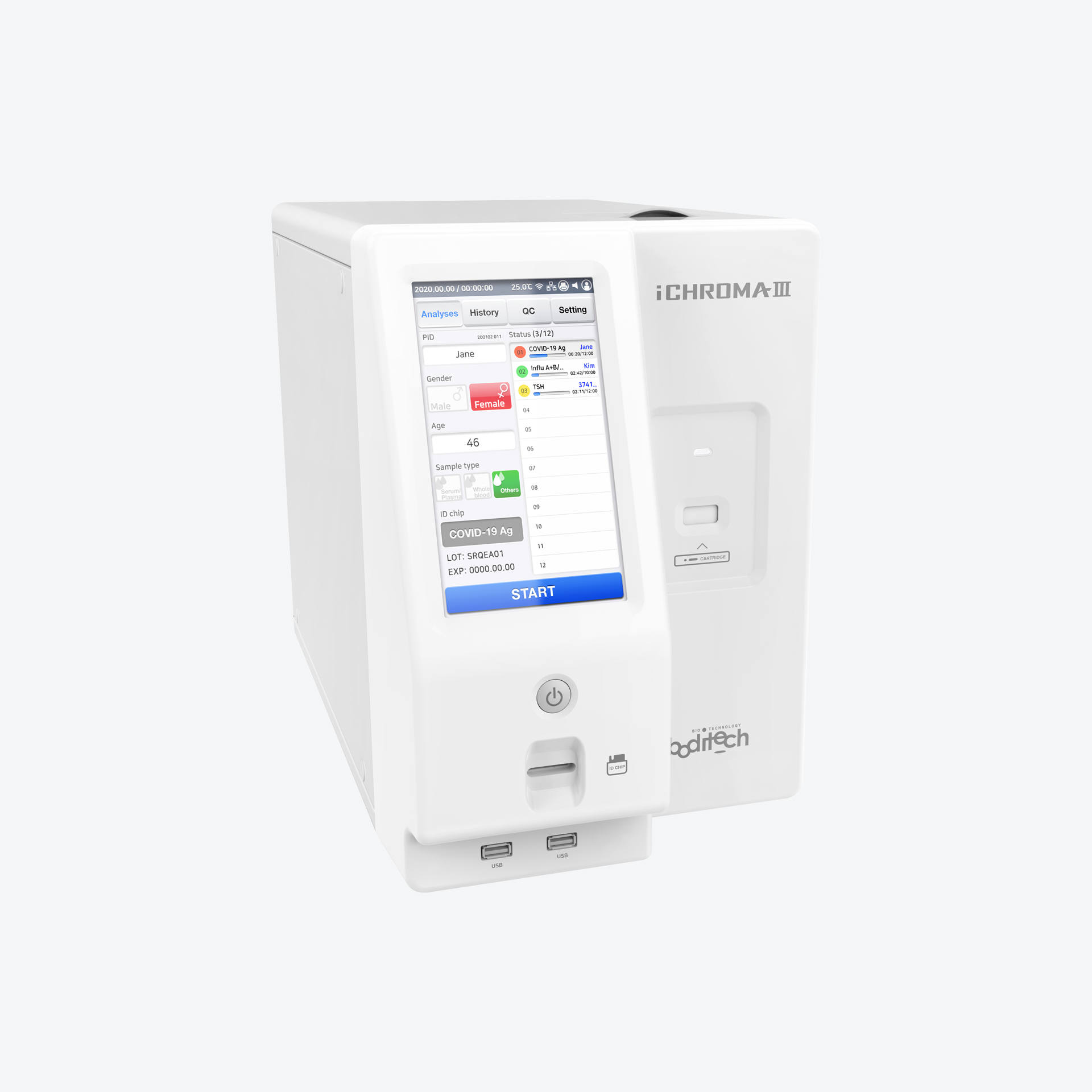 ichroma™ III accepts cartridges for various biomarkers in random sequence and processes them in a preset temperature, even combines test parameters with differing incubation period. The user will prepare each cartridge before inserting it to the system, one at a time.